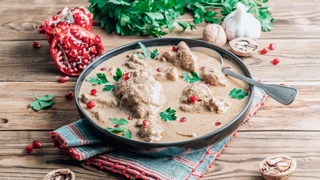 Сациви — це страва, яка втілює всю душу грузинської кухні. Вона поєднує ніжне м’ясо та густий горіховий соус, створюючи гармонію смаку й аромату. Традиційно сациви готують із курки або індички, але сучасні кухарі часто експериментують із яловичиною чи навіть овочами. Завдяки волоським горіхам страва має насичений смак і кремову текстуру, а прянощі додають неповторного аромату.
